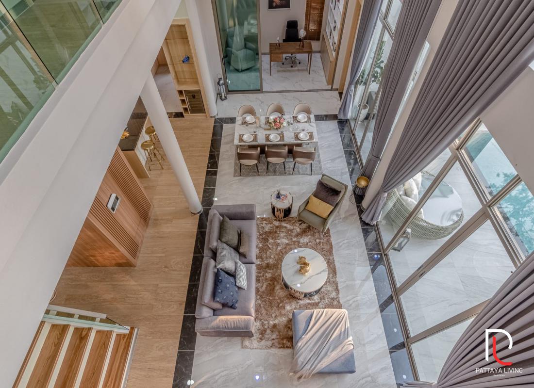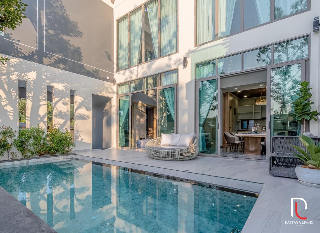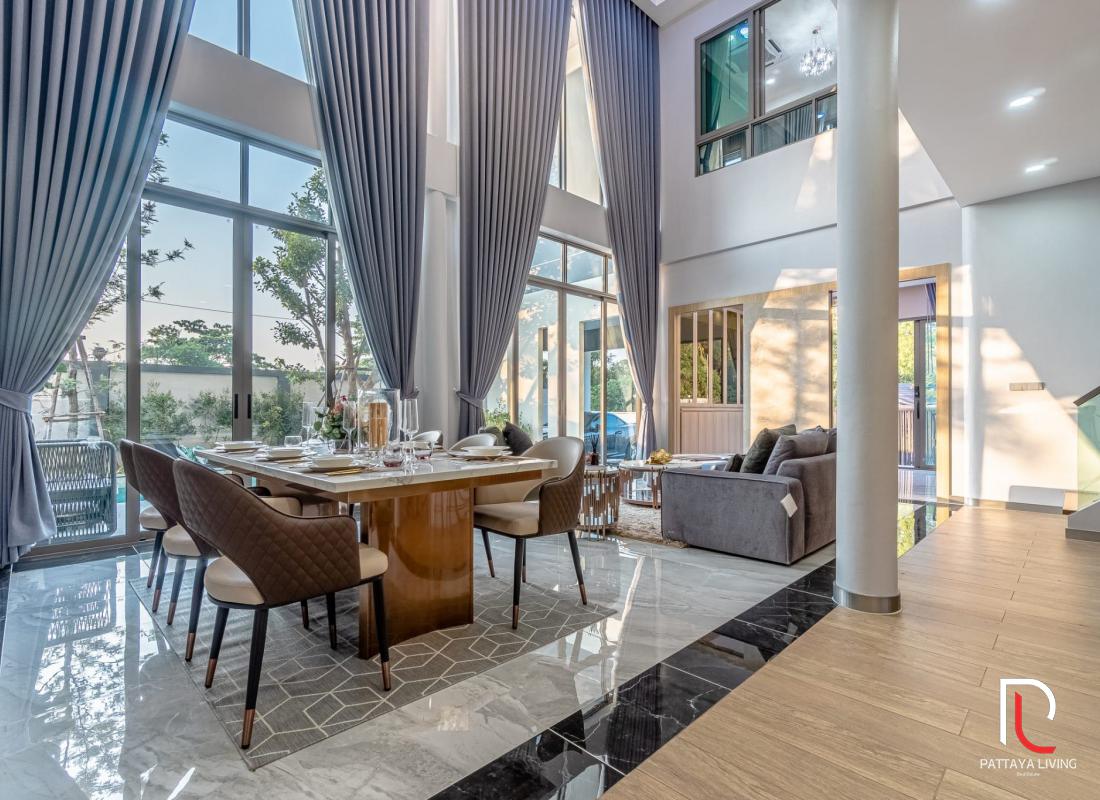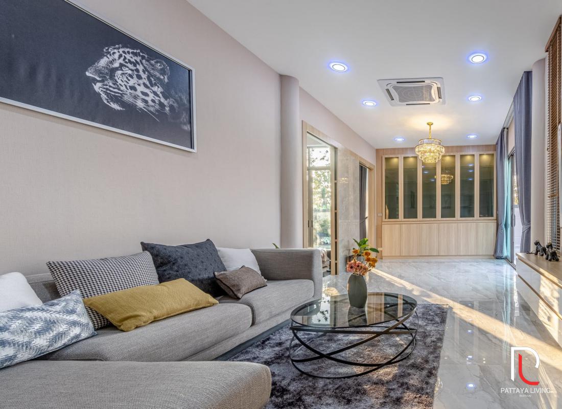 House for sale in Pattaya (East Pattaya) is a fully furnished 4-bedroom, 5-bathroom house with a private pool. It's 156 Sq.wah of land size and is in a Thai name. The transfer is 50/50 between the seller and the buyer."