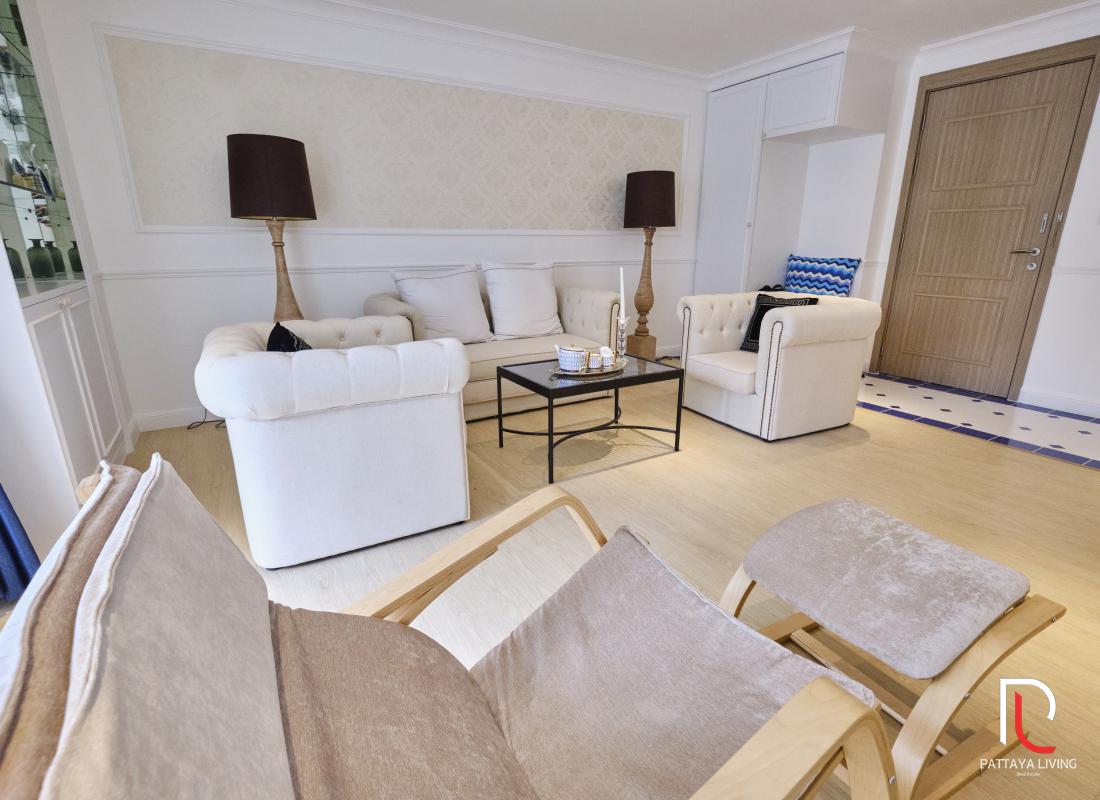 Condo for sale in Pattaya (Na Jomtien) is a fully furnished 3 bedroom 3 bathroom living size 94.18 sqm. with a pool view on 2 floors of building D, and it is in a foreign name. The transfer is 50/50 between the seller and the buyer."